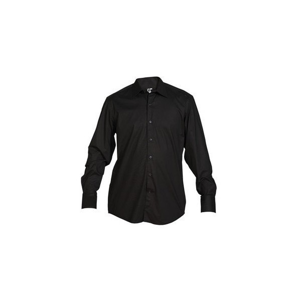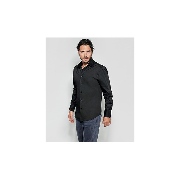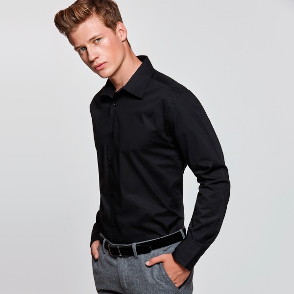 Tissu stretch. Col renforcé boutonné. Poignets avec 2 boutons. Entretien facile. 97% coton / 3% lycra, popeline, 130 grs/m².