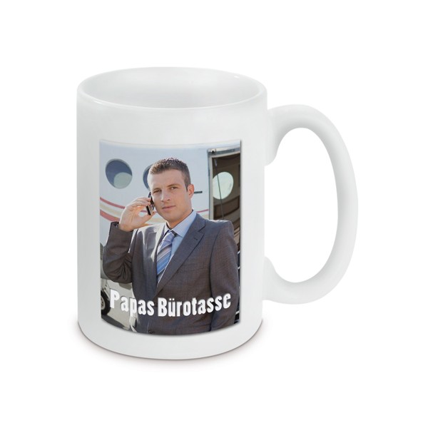Tasse blanche géante en céramique. Transfert par sublimation, résistant au lave-vaisselle. Hauteur 115 mm, diamètre 85 mm, 520 gr environ. La tasse peut être vendue sans personnalisation à 15,00 €.